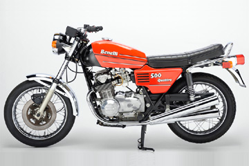 ベネリ 4&6気筒4輪はデ・トマソ、マセラッティ、イノチェンティ、2輪はベネリ、モトグッツイからなるデ・トマソ帝国を率いるアレハンドロ・デ・トマソの考えは明快でした。日本製スーパーバイクと同等のパワーを得るには、そのエンジンをそのままコピーすればいい、それを超えるには、そこから気筒数を増やせばいい、というものでした。 1972(昭和47)年、ベネリはCB500の4ストOHC4気筒エンジンを、そのままコピーし6気筒化した750セイをに市販しています。(56mmX50.6 mm のボアXストロークは両車で完全に一致します)