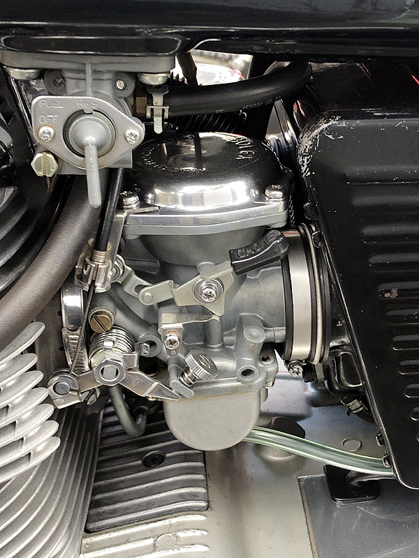 ![]() クランクケース全面中央に鎮座するホンダ流のオイルフィルターカバーのデザインまで同一、見事なまでのコピーぶりです。CBXより先に背面オルタネータを採用。ただしCBXのようにキャブを6個並べるわけにはいかなかったようで、デロルトVHB24を3連装しています。