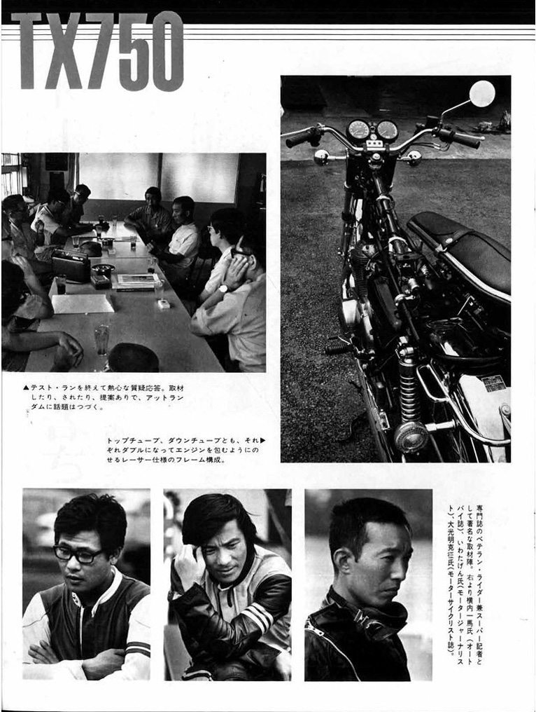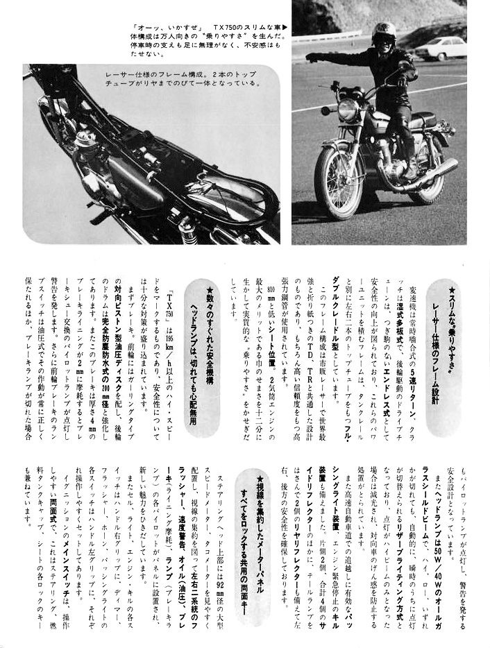 英車を強く意識したため保守的となったXS-1に対し、TX750は、独特のクランク・バランス機構、ドライサンプ潤滑、アルミリム、対向ピストンキャリパーなどを新規採用した意欲作でありました。
