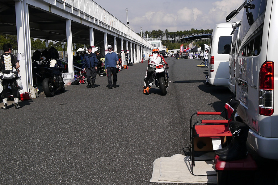 やってきた3人組の、あまりの腰の低さに脱帽いたしました。3人はピットの隅に自分たちのオートバイを一列に並べ、必要最低限だけ使った上で、どうぞ残りは自由に使ってください、と宣もうたのです・・・神ですか!?
