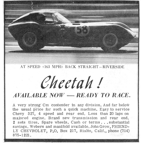 1号車はGMに買い上げられたが、後にビルによって買い戻され、スーパー・チーター(後述)のベース車両となる。 第2号車: BTRCのワークスマシン 2号車は、BTRCのワークスマシンとしてレースに使用された。 1963年シーズン デビュー戦は、1963年10月のリバーサイド200マイルが予定され、ドライバーはボブ・ボンデュラント(Bob Bondurant)が務めるはずだったが、レース数日前にドン・ホーバス(Don Horvath)がテスト走行中にクラッシュさせてしまい、本人も重傷を負い、参戦はキャンセルと相成った。(この事故で 希少なアルミボディはFRPボディに換装されている) 1964年シーズン 結局、1964年2月のリバーサイドが初レースとなった。SCG誌のテストでチーターを高く評価したジェリー・タイタスがハンドルを握り、以降、1964年シーズンのレギュラードライバーを務めたが、レース前日の練習走行中にクラッシュし、DNS(Did Not Start)で終わった。(この事故で フレーム交換が行われている) ゼッケン58は赤ボディのイメージが強いが、一時期、白ボディに赤と青のストライプで飾られていた時期があったようだ。(後に赤に戻されている)